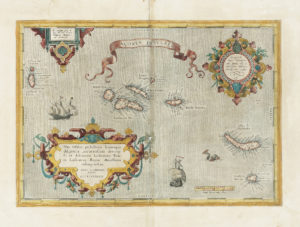 Mappa delle isole atlantiche Azzorre, da Theatrum Orbis Terrarum. Testo latino al verso. Nel cartiglio rotondo in alto a destra nota testuale dove si spiega che Le Azzorre sono qui mostrate 5° di longitudine a ovest del meridiano tolemaico. Le isole Cueruo, las Flores, Fayal, Graçiola, St George, Pico, Terçera, St Michael e St Maria, sono raffigurate con città e insediamenti. Nello specchio di mare compaiono due grandi velieri e un mostro marino, in alto al centro il titolo entro cartiglio a nastro. All'angolo in basso a sinistra, un grande cartiglio con ghirlanda di frutta e nastri, riporta il nome del cartografo gesuita portoghese Luis Teixeira al quale viene attributia la mappatura delle isole con la data 1584, anno in cui questa tavola fu pubblicata per la prima volta. (1)