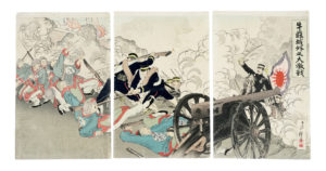 Migita TOSHIHIDE, La grande battaglia fuori dalla fortezza di Niuzhuang. — 1894 ca. — Xilografia a colori (nishiki-e). — Formato : trittico ôban tate-e verticale (mm 365x720).