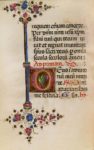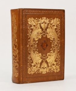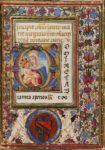 LIVRE D'HEURES A L'USAGE DE ROME, de la seconde moitié du XV°. Manuscrit latin de 173 feuillets sur velin, calligraphiés et enluminés en 1 volume in-12 (127 x 95 mm), veau blond, dentelle à froid encadrant les plats avec large motif floral doré, petite pièce de maroquin au centre, dos lisse orné de même, tranches dorées, gardes ornées de motifs arabesques avec rehauts de couleurs. (reliure du XIX°). Beau manuscrit probablement napolitain parfaitement conservé dans une élégante reliure du XIX° siècle. Belle écriture à l'encre brune et rouge, 12 lignes par page, réclames, rubriques en rouge vif, nombreuses petites initiales en rouge et bleu, élégantes initiales en bleu ou or avec décor filigrané se prolongeant dans les marges à l'encre rouge ou bleue. 4 GRANDES ENLUMINURES A PLEINE PAGE ET 7 INITIALES ORNEES peintes de 4 à 5 lignes de hauteur, vert et rose sur fond or, avec motifs floraux, et avec prolongations et besants dorés dans les marges introduisant les grandes divisions liturgiques. - Le calendrier occupe les 12 premiers feuillets (1 à 12). Calendrier en latin à l'encre rouge et noire avec de grandes initiales rouges et bleues. Le 5 février Sainte Agathe vierge, le 14 février Saint Valentin prêtre, 14 avril les Saints martyrs de Rome Tiburce et Maxime, 30 septembre Dédicace Saint Michel, 6 novembre Saint Léonard, 9 novembre dédicace de la Basilique du Sauveur de Rome, (honoré chez les franciscains). - Feuillet 13 : Vierge à l'enfant avec armoiries (Lambel à 4 fleurs de lis d'or à 2 bandes accompagné de 2 étoiles et 3 roses) dans un médaillon circulaire présenté par 2 anges, bordures de fleurs et feuillages avec 2 oiseaux affrontés. (Heures de la Vierge). - Feuillet 93 : David jouant de la Cythare avec bordures de fleurs et papillons et deux oiseaux affrontés (Sept psaumes de la pénitence). - Feuillet 121: Squelette les mains croisées, bordures de fleurs avec vase d'or (Office des morts). - Feuillet 167: Crucifix sur le mont Golgotha, bordures de fleurs avec vase d'or et oiseaux affrontés (Heures de la Croix) Exemplaire en parfait état. Ex-libris Froissart et bibliotheca Panziatik (grec).