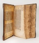 (1476). VORAGINE (Jacques de). DE LEGENDA AUREA SANCTORUM, SIVE LOMBARDICA HISTORIA. (Strasbourg, Georg Husner, vers 1476). Fort volume in-folio gothique de 396 (sur 420) feuillets, veau estampé sur ais de bois, dos à nerfs (reliure de l'époque). Très rare édition incunable de l'un des plus célèbres textes de la période médiévale. La Légende Dorée relatant la vie et le martyr des premiers Saints du calendrier bénéficia d'une immense popularité dès l'invention de l'imprimerie ; il y eut au XV° siècle près de 150 éditions dans toute l'Europe. Magnifique impression de Georges Husner, imprimeur-humaniste strasbourgeois fondeur de caractères et imprimeur, l'un des premiers installés à Strasbourg. L'ouvrage est entièrement rubriqué en rouge et a conservé ses marges originelles, le papier est très épais. Le feuillet 390 est déchiré en deux avec manque, les feuillets 388 et 419 et les 24 premiers feuillets sont manquants. Mouillures, quelques taches, réparation au feuillet 407, manque de quelques lettres au dernier feuillet, dos entièrement refait. (ISTC, ij00088000).