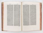 (1503). ORIGÈNE. IN GENESIM, EXODUM, LEVITICUM…HOMELIAE, DIVO HIERONYMO INTERPRETE. Venise, Alde Manuce, février 1503. In-folio de [6]-182 feuillets, demi-maroquin rouge, dos orné à la grotesque (reliure du XIX°). ÉDITION PRINCEPS. Traduction de Rufin d'Aquilée (et non de Saint Jérôme comme annoncé par Alde) des homélies d'Origène. Au verso du titre, Alde dédie son livre au cabaliste chrétien Gilles de Viterbe à qui il demande son soutien; puis une seconde préface, anonyme, renferme un passage curieux relatif à Alde et à son associé et beau-père. Grande ancre aldine gravée sur bois in fine. Texte sur 2 colonnes, 6 premiers feuillets restaurés en marge et lavés, quelques cernes, petites salissures, bords des plats usés, sinon bon exemplaire. Ex-libris imprimé Tourgueneff. (Renouard, p.44) (Brunet, IV, 228 «Volume rare»).