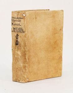 (1503). VORAGINE (J. de). LEGENDE SANCTORUM epistolam que januensem. est autem hic liber trionymus. (sp.i) a plerisque inscribitur (sp.ii) longobardica historia. (Strasbourg, Georg Husner, 1503). In-8 gothique de 290 feuillets, velin à recouvrement (reliure de l'époque). Impression sur 2 colonnes de Georges Husner, fondeur de caractères et imprimeur, l'un des premiers installés à Strasbourg. Titre un peu défraîchi. (USTC, 671824, 9 ex.).