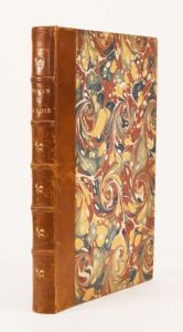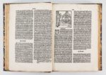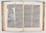 (1503). LORRIS, (Guillaume de) - MEUNG (Jehan de). LE ROMAN DE LA ROSE. C'EST LE ROMANT DE LA ROSE, MORALISE CLER ET NET TRASLATE DE RIME EN PROSE PAR VOSTRE HUBLE MOLINET. Lyon, Guillaume Balsarin, 1503. In-4° gothique de 138 (sur 153) feuillets, 45 lignes par page, demi-basane fauve, dos à nerfs orné (reliure du XIX°). Ouvrage qui eut une influence considérable au Moyen-Age et l'un des monuments les plus importants de la langue et de la poésie française. Commencé vers 1230 par Guillaume de Lorris, il fut repris quarante ans plus tard par J. de Meung qui ajouta près de 18.000 vers aux 400 laissés par son prédécesseur. Première édition de la transcription en prose que J. Molinet (1435-1507) fit à la demande de Philippe de Clèves, où l'auteur ajoute à l'histoire du roman un certain nombre de moralités. L'illustration, comportant UNE CENTAINE DE BOIS est inspirées des premières éditions lyonnaises. Il manque 15 feuillets dont le titre (1-5,8,9,10,15,69,72,151,152,153,154), un bois découpé page 94, 2 feuillets tachés (40/41), cernes clairs en haut des feuillets sur l'ensemble (En français dans le texte, 18) (USTC 30256, 9 ex.) (Baudrier XII, p. 60) (Pas dans Bechtel). (Brunet III, 1176) (Tchemerzine IV, 234).