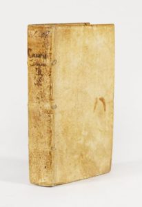 (1508). BEROALDE (Ph.). COMMENTARII CAESARIS RECOGNITI. (Lyon, Balthazar de Gabiano, 20 juin 1508). In-8 de [3]-252-[40] feuillets, velin rigide à recouvrement (reliure de l'époque). Contrefaçon aldine faite à Lyon, elle serait plus rare que l'édition originale. Renouard indique «Evidemment imprimé par le même Balthazar de Lyon qui a donné le Suétone de 1508 et plusieurs autres éditions des mêmes temps...». Edition donnée par le célèbre humaniste italien Philippe Béroalde à qui l'on doit de nombreuses éditions d'anciens auteurs latins. Quelques cernes et rousseurs claires sinon bon exemplaire dont le titre est orné d'un encadrement peint avec un blason entouré de 2 dauphins surmonté d'une fleur de lys. (USTC 14337, 6 ex.) (Renouard p. 309, n°25) (Baudrier VII, 22).