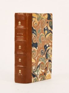 (1514). PONTANUS (Joannis). OPERA. Lyon, Barthelemy Troth, février 1514. In-8 de 346 (sur 356) feuillets non chiffrés, demi-basane châtaigne, dos à nerfs orné (reliure moderne). Cette belle impression contient 11 traités philosophiques de l'humaniste italien Pontanus (1426-1503): De Fortudine - De Principe - Dialogus qui Charon inscribitur. Dialogus qui Antonius inscribitur - De Liberalitate. - De Beneficetia - De Magnificentia - De Splendore - De Conviventia - De Obedentia - De Prudentia. Titre imprimé en rouge avec fleur de lys. D'après Renouard cette édition imprimée avec les caractères italiques semblables à ceux des Alde, d'origine italienne, ne peut être imputée aux presses lyonnaises... Il manque 10 feuillets. Mouillures claires sur qq. feuillets (Baudrier VIII, 426) (Renouard p. 313, n°45) (Heilbrun, contrefaçons aldines, p. 16) (USTC 155225).