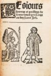 1515? (Anonyme). LES JOURS HEUREUX ET PERILLEUX DE L'ANNEE REVELE PAR L'ANGE AU BON SAINCT JOB. Sans lieu ni nom ni date (Lyon, Arnoullet, Chaussard, 1515?). In-12 gothique de 4 feuillets, 21 lignes par page, maroquin bordeaux (Laurenchet). Amusantes prophéties populaires qui indique au lecteur les «jours périlleux esquels ne fauct riens bon commencer» pour chaque mois. Par exemple, Pierre Bonnart, natif de Bourgogne partit à la Sainte Agathe voir son sien compère Guyot et vit en sa maison une tresse d'oignons, voulut en manger, monta sur une échelle, versa en arrière et se rompit le col! L'exemplaire, fort rare, est illustré de 2 bois de facture populaire, l'un au titre montrant l'Ange et Job et un autre au verso du dernier feuillet représentant un roi assis sur son trône. Baudrier signale 2 exemplaires mais avec des différences de nombre de lignes ou de bois. (USTC, 31339 ?, 1 ex.).