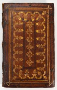 (1516). MANTUAN (Baptiste). AD MORTALIUM OBLECTATIONEM AUCTORIS EFFIGIEM HUIC DIVINO OPERI. ULTIMA PARS OPERIS. Lyon, impressa solertia Stephani de Basignana, in officina Bernard Lescuyer, juin 1516. In-8 de 126 feuillets, veau clair, plats ornés de multiples filets dorés et à froid avec un cadre orné d'une chaine de glands liés avec au centre des motifs dorés répétés du «nœud éternel», double encadrement à chaud et à froid, tranches dorées et ciselées, coffret moderne (reliure de l'époque). RARISSIME PRODUCTION D'ETIENNE DE BASIGNANA, religieux de l'ordre des Carmes et remarquable typographe qui n'imprima que 2 livres: un livre d'heures et pour Bernard Lescuyer, les oeuvres de Mantuan, général de son ordre. Les oeuvres de Spagnioli, formées de 2 parties qui se subdivisent elles-mêmes, pouvaient se vendre séparément comme l'indique Brunet. Cet exemplaire comprend le «De Sacris Diebus», qui se trouve en édition originale. L'impression de ce volume rivalise avec celle des plus grands typographes. Le titre imprimé en rouge et noir est orné de l'effigie de Baptiste Mantuan. «C'est un des plus anciens exemples de l'utilisation du portrait dans l'illustration du livre» (Brun). Le dernier feuillet s'orne des armes du cardinal de Gonzague. Titre bruni, trous de vers réparés, petites réparations bien exécutées sur quelques feuillets, second plat presque détaché, gardes remplacées, le cahier d, et q8 légèrement vermifugé et presque dérelié. Intéressante reliure italienne dont la combinaison des 2 motifs de la reliure semble très peu courante selon Goldschmidt (Gothic and Renaissance Bookbindings, 1928, I, p. 226). Des bibliothèques Carolus Hippolitus Tedeschius (signature contemporaine sur le blanc q7). et Michel Wittock avec son ex-libris. (Baudrier II, 3-10) (USTC 155285) (Brunet III, 1375) (Brun, p. 253).