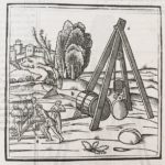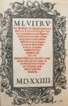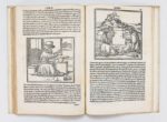 Elle est abondamment ornée de 136 REMARQUABLES FIGURES gravées sur bois; invention du feu, construction de huttes ou machines pour tirer des gros fardeaux, machines hydrauliques, théâtres romains, signes du zodiaque et même Archimède faisant l'expérience de son incontournable principe, tous fortement inspirés de la première édition vénitienne illustrée de 1511. Très beau titre gravé imprimé en rouge et placé dans un riche encadrement renaissance. Titre doublé, le 8ème feuillet de table est manquant. (USTC 863685, 37 ex.) (Mortimer, Italian 545).