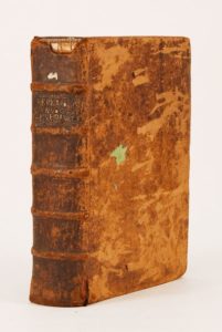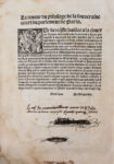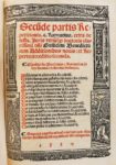 (1530). BENOIT (Guillaume). REPERTORIUM UTILISSIMUM IN PRIMAM ET SECUNDAM PARTIS REPETITIONIS CAPITULI RAYNUTIUS EXTRA DE TESTAMENTIS. Lyon, Denis de Harsy, 1530. 3 parties de [41]-1bl.; [4]-1 à 262; [1]-264 à 431 feuillets, reliées en 1 volume in-4°, basane claire, dos à nerfs (reliure postérieure). Chaque partie à son propre titre. Le titre général avec la marque de Simon Vincent dans l'encadrement, la première et la seconde datées de 1530. Impression lyonnaise en caractères gothiques sur 2 colonnes qui semble rare, non répertoriée dans l'USTC avec cette collation. Le verso du troisième titre est orné d'un grand bois intitulé Arbor Substitutionum, Au verso du feuillet 4, un grand bois montrant Guillaume Benoît, (1455-1516) professeur à l'université de Cahors, à sa chaire devant ses élèves. Reliure usagée, nombreuses annotations marginales, cernes épars. (USTC, 200140, 1 ex.).