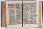 (1530). MISSALE AD USUM ECCLESIE ROMANE. Paris, François Regnault, 1530. In-8 de [8]-142 (sur143)-[42]-69 feuillets, veau, dos à nerfs orné (reliure du XVIII°). Impression sur 2 colonnes en caractères gothiques rouges et noirs. Le titre est placé dans un grand encadrement, suit un bois à pleine page montrant le roi David entouré de ses courtisanes et courtisans et un autre à mi-page de la crucifixion; tout le texte est agrémenté d'une CENTAINE DE PETITS BOIS RECTANGULAIRES. Titre remonté, qq. rousseurs, le feuillet 137 manquant est remplacé par 2 feuillets blancs. La musique notée est imprimée en rouge. (USTC 146171, pas d'ex.).