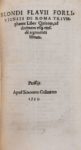 (1533). BIONDO (Flavio). DE ROMA TRIUMPHANTE LIBRI X PRISCORUM LECTORIBUS UTILISSIMI... Paris, Simon de Colines, 1533. 2 tomes en 1 vol. in-8 de [11]-1bl.-156-[10]-168 feuillets, basane marbrée, dos à nerfs orné (reliure du XVIII°). Publié pour la première fois en 1459, De Roma triumphante fait partie d'une série d'ouvrages consacrés par Biondo à l'étude et à la reconnaissance des ruines de la Rome antique, ce qui lui a valu la réputation d'être l'ancêtre des archéologues. C'est le premier exemple en Europe d'une bonne méthode historique. Qq. cernes, petit trou au f. 20, un plat détaché partiellement. (USTC 203332, 3 ex.) (Renouard, p. 213-214).