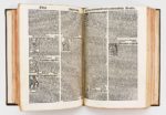 (1534). NATALIBUS (Pierre de). CATALOGUS SANCTORUM, VITAS, PASSIONES ET MIRACULA COMMODISSIME ANNECTENS. Lyon, Nicolas Petit pour Hector Penet, 1534. In-4° gothique à 2 colonnes de [4]-293 feuillets, basane marron, filets à froid sur les plats (reliure moderne) Belle édition lyonnaise de la légende des saints, dont l'illustration comprend PLUS DE 300 VIGNETTES représentant des scènes de martyres et de supplices. Le titre imprimé en rouge et noir est placé dans un riche encadrement. Plusieurs passages rayés, réparation au feuillet 94 avec manque, cernes clairs aux derniers feuillets. (USTC, 146694).