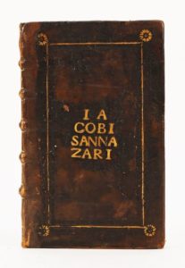 (1535). SANNAZARO (Jacopo). OPERA OMNIA LATINE SCRIPTA NUPER EDITA. Venise, haeredum Aldi Manutii et Andreae Asulani Soceri, Septembre 1535. In-8 de 41-[1]-61 (numér. de 3 à 63)-[1] feuillets, veau brun, nom de l'auteur en lettres dorées sur les plats, encadrement doré avec roulette d'angle (reliure de l'époque). Sannazar (1458-1530) fut reçu à l'Académie Pontana sous le nom d'Actius Sincerus. Les premiers feuillets renferment son poème De Partu Virginis, les 5 églogues sont précédées du titre et d'une préface de P. Manuce Antonio Carloni à qui Sannazar en mourant avait recommandé ses ouvrages. Ensuite un faux titre pour les élégies et les épigrammes. Cette édition est plus complète que les précédentes. Dos entièrement refait (USTC, 854667) (Renouard, p. 204).