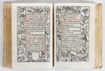 (1541). HEURES DE LA VIERGE. HORAE IN LAUDEM BEATISSIMAE VIRGINIS MARIAE AD USUM ROMANUM. Paris, Olivier Maillard, 1541. In-12 de 176 feuillets non chiffrés (A-Y8), velin ivoire rigide, dos lisse (reliure de l'époque). Très beau livre d'heures imprimé en lettres rondes rouges et noires, orné à chaque page de bordures variées avec fleurs, fruits, animaux, etc... DIX-NEUF FIGURES A PLEINE PAGE ornent le volume; elles sont particulièrement remarquables et toutes, sauf pour une plus petite, sortent de l'atelier de Geoffroy Tory dont Olivier Maillard était le successeur. Certaines sont disposées par paire, se faisant face, procédé utilisé par Tory dans ses grandes heures. Restauration ancienne au dos, très bon exemplaire. (Brunet V, 1660). (USTC 140204, 4 ex. coll. erronée).