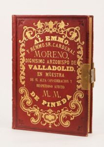 (1546). MISSALE AD USUM ROMANUM. Lyon, Hector Penet pour Jacques de Giunta, 1546. In-4° de [15]-248 (sur 251) feuillets, chagrin grenat, grande inscription dorée sur le premier plats, tranches dorées, fermoirs (reliure du XIX°). Texte imprimé en rouge et noir en caractères gothiques avec musique notée et de très nombreuses lettrines de grande taille. Il manque 4 feuillets, d'autres réparés avec manque de texte. Exemplaire de présent avec l'inscription espagnole «Au très éminent et très révérend cardinal Moreno, insigne archevêque de Valladolid, en témoignage de sa haute considération et de son affectueux respect. MM. de Pineda». Bel état. (USTC 157678).
