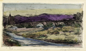 Luigi BARTOLONI, Ponte in montagna. — 1939. — Acquaforte su carta applicata colorata a mano. — mm 170x300. — Foglio : mm 350x496.