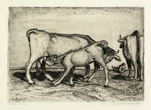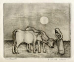 3) La vacca e il vaccino. Acquaforte. mm 205x285. Foglio : mm 265x400. Firmata in lastra in basso a sinistra, controfirmata a matita in basso a destra. Titolata a matita in basso a sinistra. Iscritto "27" in lastra al margine superiore centrale del foglio. (3)