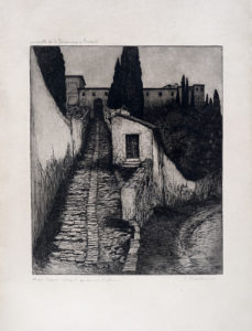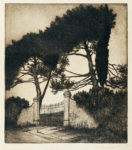 2) L'entrata della villa. 1926. Acquaforte. mm 330x295. Foglio : mm 442x400. Titolata a matita in basso a sinistra. Firmata e dedicata a R. Romanelli a matita in basso a destra. (2)