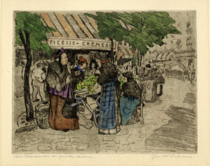 2) Paris - Marchandes des quattre saisons. Acquaforte colorata a mano. mm 245x320. Foglio : mm 360x430. Firmata a matita in basso a destra, titolata a matita in basso a sinistra. (2)