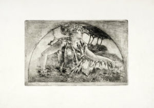2) Delusione. 1897 ca. Acquaforte e monotipo. mm 250x390. Foglio : mm 445x640. BIANCHI-GINEX, 44. Firmata a monotipo in basso a sinistra. Opera nel I stato su 3, prima del rafforzamento della campitura dei capelli e dei cespugli alla destra della figura. (2)