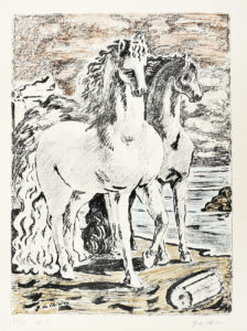 Giorgio DE CHIRICO, Cavalli antichi. — 1966. — litografia a colori. — mm 460x335. — Foglio : mm 555x454.