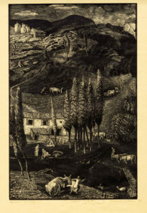 1) Autunno marchigiano. 1939. Xilografia. mm 358x235. Foglio : mm 475x325. Firmata e datata a penna e inchiostro di china bruno in basso a destra. Titolata a penna e inchiostro di china bruno in basso a sinistra. Iscrizione "Xilografia (antilettera) quadriennale romana) a penna e inchiostro di china bruno in basso al centro.