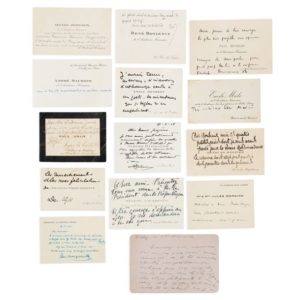 CARTES DE VISITE. Ensemble de 34 cartes de visite autographes, la plupart autographes signées (ou paraphées): Paul Bourget, René Bazin, Henri Bergson, Henri Bordeaux (2), Jules Romains, Fernand Gregh, André Maurois, Émile Henriot, Charles Guérin, Émile Mâle, Jules Massenet (2), Francis de Croisset, René Boylesve (2), Charles Léandre, Roger Vercel, Fernand Vrolyk, Jean Pourtal de Ladevèze, André Mary, Lucien Lepoittevin, H.A. Quéru, Paul-Jean Toulet (vierge), Catherine de Monicault, Cécile Périn, Paul Adam, Hélène Vacaresco, Francis Vielé-Griffin, Paul Margueritte, Paul Reboux (sur une carte de Mme G.Y. Lotte), Albert Guillaume, Georges d'Espagnat et Henri de Régnier