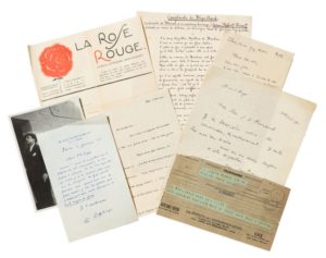 LITTÉRATURE. Fort lot d'environ 200 lettres, majoritairement des lettres autographes signées dont une bonne partie est adressée à l'écrivain Jean-Joseph Renaud (1873-1953). Jean Ajalbert (2 dont un en-tête de l'Académie Goncourt); Théodore de Banville; Gérard Bauër; Maurice Bedel (3); Pierre Benoit (3); Louis Bertrand; André Billy (5); Léon Blum; Jules Bois; Paul Bourget (2); Eugène Brieux; Francis Carco (6 et une belle photographie de Carco en Egypte, fumant devant des hiéroglyphes); André Chevrillon; Judith Cladel; Jean Cocteau (L.A.S. et télégramme); André Corthis; Georges Courteline; Francis de Croisset;Guy-Charles Cros; Lucien Daudet (2); Charles Derennes; Lucien Descaves (4); Gaston Deschamps; Léon Dierx; Georges Duhamel (2); Luc Durtain; Henri Duvernois(3); Georges Faillet dit Fagus (2); Claude Farrère (2); Eugène Fasquelle (2); Feuillet de Conches (sur la correspondance de Louis XVI, Marie-Antoinette et Mme Elisabeth); André Fontainas; Paul Fort (10 dont poème, manuscrits, etc.); Maurice Garçon (3); Gustave Geoffroy; Serge Groussard; Maurice Genevoix; Fernand Gregh(8); Gyp; Edmond Haraucourt; Émile Henriot(2); Abel Hermant (2); Gérard d'Houville; Etienne Lamy; Raymond de La Tailhède; Laurens; Henri Lavedan; Maurice Leblanc; Charles Leconte de Lisle; Hubert Lyautey (télégramme); Louis Madelin (2); Maurice Magre (2); Jules Massenet; Paul Marguerite; Charles Maurras(en-tête de l'Action française); André Maurois; Fernand Mazade(2); Francis de Miomandre(2); Raoul Ponchon; Charles-Louis Philippe; Paul Reboux (2); Henri de Régnier (7); Marie de Régnier (3); Jean Richepin (2 dont poème); J.-H. Rosny (Jeune et Ainé); Jean Royère; Maurice Schumann; André Siegfried (7); Albert-Emile Sorel; Sully Prudhomme; Pasteur Vallery-Radot (4); Paul Valéry; Fernand Vandérem; Léon Vérane (2); Alfred de Vigny (enveloppe autographe); Maxime Weygand; Léon Hennique; Philippe Chabaneix (6 dessins); Jean-Louis Vaudoyer (M.A.S. «Le Jardin romantique. 5 pp. ½ in-4); Théodore Botrel (M.A.S. «Ma Mitrailleuse». 2 pp. in-folio, crayon à papier), etc
