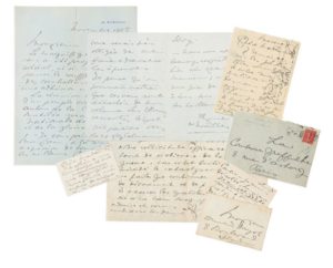 NOAILLES, Anna de (1876-1933), poétesse et romancière Ensemble de 6 documents: - 3 L.A.S. dont une à la comtesse Greffulhe. 6 pp. in-4 et in-8. Taches et papier collant à un document. Elle évoque Les Eaux de Damas, Ivresse au Printemps et Soir à Saint-Cloud, à paraître dans le Figaro «ces vers sont détachés de mon volume Les Éblouissements, lequel doit paraître vers le 20 chez Calmann Lévy »; elle souhaite à Elisabeth de Caraman-Chimay de ne pas être affectée par les «propos écrits», «votre nom étant mis là sans autre conséquence que de rappeler aux lecteurs qu'il existe, parmi la guerre et ses malheurs, un être beau et bon, qui doit dédaigner de se défendre, étant l'amie du Roi et de la Reine [...]» et loue son dévouement et son patriotisme, etc. - 3 cartes autographes signées dont à Armand Dayot et à Melle Dayot. 5 pp. in-12 et in-16 oblong. Une adresse au verso et une enveloppe conservée. On joint une enveloppe adressée à la comtesse Greffulhe