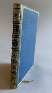 JEUX DE CALLIOPE (Les), ou Collection de poèmes anglais, italiens, allemands et espagnols, en deux, trois & quatre Chants. Londres, Paris, Ruault, 1776. 3 parties en un volume in-8, maroquin bleu roi, triple filet doré, dos orné, dentelle intérieure, tranches dorées (Chambolle-Duru). Ouvrage comprenant des traductions de trois poèmes: l'Économie de l'amour d'Armstrong, celui-ci orné de 4 figures gravées en taille-douce par Marchand d'après Gibelin, L'Hermite ou Amintor et Théodora de Mallet, et L'Amour accusé de Wiéland. (Cohen, col. 518.) Très bel exemplaire en grand papier, parfaitement établi par Chambolle-Duru. De la bibliothèque Genard (1882, n°395). Petite fente discrètement restaurée en haut du feuillet S2
