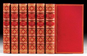 MOLIÈRE Les oeuvres. Amsterdam, Jacques Le Jeune, 1675. 5 volumes. — Les oeuvres posthumes. Amsterdam, Guillaume Le Jeune, 1689. Un volume. Ensemble 6 volumes petit in-12, maroquin rouge, triple filet doré, dos orné, dentelle intérieure, tranches dorées (F. Bedford). Édition collective elzévirienne, très recherchée, formée de la réunion des 27 pièces imprimées séparément par Daniel Elzevier. (Guibert, II, p. 699 et s. — Tchemerzine, IV, p. 825. — Willems, n°1511.) Elle est ornée d'un frontispice gravé sur cuivre, non signé, en tête du tome I. Les Fourberies de Scapin, Psiché et le Malade imaginaire (prologue et intermède) sont aux bonnes dates, du tirage A (1671 pour les deux premières pièces, 1673 pour la dernière). Les autres pièces sont datées 1674 ou 1675, à l'exception de Tartuffe qui est à la date de 1669 (cf. Willems, n°1418; tirage A selon Guibert). Le volume des oeuvres posthumes contient les Amants magnifiques, la Comtesse d'Escarbagnas, l'Impromptu de Versailles, Dom Garcie de Navarre et Melicerte; y ont été ajoutés Le Festin de Pierre dans l'édition d'Amsterdam de 1683, qui donne le texte intégral, et une édition de 1690 du Malade imaginaire. Chacune des 7 pièces citées ci-avant est ornée d'une figure gravée en taille-douce. La pièce de Tartuffe a été enrichie au moment de la reliure de la préface de la réimpression elzévirienne (5 feuillets signés *2-6). Très bel exemplaire, bien établi par Bedford. Petite perforation supprimant les numéros de pages à deux feuillets (tomes II et V). Petite mouillure sur la tranche latérale au tome III avec légère auréole dans la marge des cahiers touchés. Habile et discrète restauration marginale à 2 feuillets. Infime éclat sur le premier plat du tome I