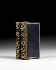 RACINE (Jean) Oeuvres. Paris, Pierre Traboüillet, 1697. 2 volumes in-12, maroquin bleu nuit, triple filet doré, dos orné, dentelle intérieure, tranches dorées (Yseux sr de Simier). Troisième édition collective, la dernière publiée du vivant de Racine. Elle est la première complète, puisqu'elle comprend les Cantiques et les deux dernières pièces de Racine, Esther et Athalie, publiées en 1689 et en 1691. C'est la version définitive, qui a fixé le texte des éditions postérieures. (Tchemerzine, V, p. 360.) L'illustration comporte 2 frontispices, dont un gravé d'après Charles Le Brun, et 12 figures gravées en taille-douce par François Chauveau. Papier souvent jauni par le lavage