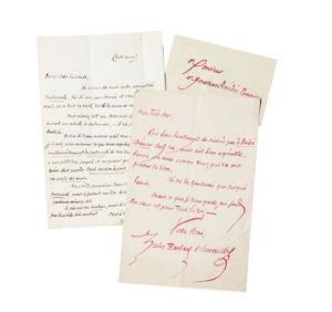 BARBEY D'AUREVILLY (Jules) Ensemble de 2 lettres: - L.A.S. à Amédée Pommier. S.l.n.d. [Décembre 1874]. 1 p. in-8. Encre rouge. Enveloppe conservée. «C'est bien honteux de n'avoir pas d'André Chénier chez soi, mais c'est bien agréable d'avoir un ami comme vous, qui va me prêter le sien. Je ne le garderai que jusqu'à lundi. Mais ce que je vous garde, au fond du cœur, est pour toute la vie; - Votre ami [...]». Grande et belle signature. Lettre publiée in Barbey d'Aurevilly, Correspondance générale (Belles-lettres, 1980) VII, 1874/62, p. 244. - L.A.S. à Francis Lacombe. S.l.n.d. [cachet à la date du 15 février 1850]. 1 p. in-8. Encre noire. Adresse au verso du second feuillet. «[...] je viens de voir votre Assemblée nationale. J'ai été un peu étonné, et comme entre amis, on se doit la vérité, voilà la cause de mon étonnement. Vous m'aviez dit que mon ami Louis Couture aurait un article, le lendemain, - il n'a point eu d'article. Et il a été si peu nommé qu'il vous a écrit, comme je le vois, pour réclamer ce que vous appelez selon moi assez malhonnêtement la paternité de son livre. Votre rectification a un petit ton impoli et moqueur qui n'est pas celui qu'on doit prendre, toute opinion à part, quand on parle des amis des amis [...]»