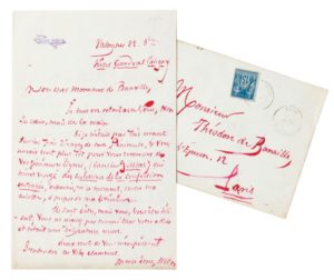 BARBEY D'AUREVILLY (Jules) L.A.S. à Théodore de Banville. Valognes, hôtel Grandval-Caligny, 22 octobre 1882. 2 pp. in-8. Encre rouge. Enveloppe conservée avec cachets postaux. «Je suis en retard avec vous, non du cœur, mais de la main. Si je n'étais pas très errant sur les rivages de ma péninsule, je vous aurais écrit plus tôt pour vous remercier de vos généreuses lignes, (dans le Gil Blas) qui m'ont vengé des culottiers de la Confection outragée, acharnés, en ce moment, contre ma culotte, à propos de ma littérature. Ils sont bêtes, mais vous, vous êtes délicat. Vous ne m'avez pas nommé dans votre article et c'était une délicatesse encore. Deux mots de vous m'empêchent d'entendre ces viles clameurs. Merci donc, mon cher Monsieur de Banville, et chaude poignée de main [...]. Mon respect à Madame de Banville». Beau document