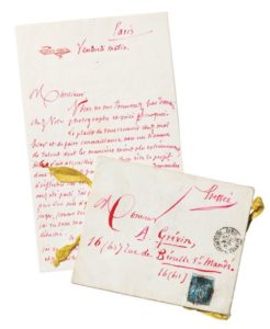 BARBEY D'AUREVILLY (Jules) L.A.S. à Alfred Grévin. Paris, «Vendredi matin» [1881]. 3 pp. in-8. Encre rouge. En-tête gravé en rouge «Never more» répété sur l'enveloppe conservée avec cachets postaux et lacs de soie. Importante lettre de Barbey à Grévin, violement opposé à son projet de musée. « Vous ne me trouverez pas demain chez votre photographe et voici pourquoi. Le plaisir de vous recevoir chez moi hier et de faire connaissance avec un homme de talent dont les manières m'ont plu extrêmement, m'a fait accueillir un peu trop vite le projet dont vous m'avez parlé ? J'aurais dû vous demander de réfléchir sur votre proposition; mais quand vous avez été parti j'ai pensé à ce que vous m'aviez exposé, je me suis mis à quatre pas de votre idée pour la juger, (comme vous feriez pour un tableau) et ce que j'ai vu dans ma réflexion m'en a complètement détaché. Je ne connais pas le Musée Tussaud, mais j'ai vu quelquefois dans ma vie des Cabinets de Curtius [Philippe-Guillaume Mathé, dit Curtius avait fondé un cabinet de cire très célèbre sous Louis XVI, au Palais-Royal], et je les ai toujours trouvés affreux. L'impression qu'ils m'ont faite m'est revenue, vilaine vision ! Et, quelque talent qu'il y ait dans votre musée, ce sera toujours un cabinet de Curtius ! Ce sera toujours de l'art grossier - de la vie figée, - du trompe l'œil qu'on ne trompe jamais... Ces statues, à ressorts mécaniques, habillées avec des vêtements réels, ces moulages de cire coloriés, cette vie qui n'est pas la vie qu'on veut, obtenue par les moyens les plus brutalement matériels et qui n'est, en définitive, qu'une odieuse & impuissante singerie de la vie, tout cela est revenu dans ma pensée [...] vous qui m'avez été sympathique tout de suite, j'avais dit trop vite « oui » à votre projet. Vous m'auriez demandé ma personne pour un portrait ou pour une statue, c'eut été différent: c'eut été de l'art, dans sa notion élevée & vraie, mais ici l'art n'est pas [...]». Lettre publiée in Barbey d'Aurevilly, Correspondance générale (Belles-lettres, 1980) VIII, 1881/30, p. 290