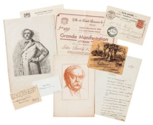 AUTOUR DE BARBEY D'AUREVILLY Lot de 5 documents: - HUYSMANS, Joris-Karl. Carte de visite autographe signée. S.l.n.d. 1 p. in-16 oblong. «Cher ami, une carte de plus! mais ne répondez pas à celle-là; elle est simplement pour le plaisir de celui qui l'envoie et qui met une affectueuse poignée de main [...]». - VIVIEN, Renée. Carte postale autographe signée à Katy Hope [sa maîtresse Kérimé Turkhan-Pacha], en Turquie. Septembre 1904. 1 p. in-12 oblong avec adresse au verso, timbre et marques postales (Bâle et Constantinople). «My love and thoughts R.V.». [Renée Vivien et Kérimé entretinrent une correspondance brûlante à partir de 1904]. - BLOY, Léon. Carte de visite vierge «Entrepreneur de démolitions». 1 p. in-16 oblong. - HUGUES, Clovis. Dessin à l'encre daté de 1905 et signé en bas à droite. 9,1 x 11,4 cm. - SAINTE-BEUVE. L.A.S. à Barbey d'Aurevilly. 1 p. in-8, [1851] après l'envoi des Prophètes du passé. On joint un portrait de Léon Bloy, divers documents autour de Barbey d'Aurevilly, des lettres de Gabriel de Broglie, Léopold Delisle, du duc du Maine (1704 à Chamillart), etc