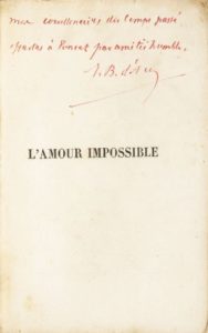 BARBEY D'AUREVILLY (Jules) L'Amour impossible. Chronique parisienne. Paris, Librairie nouvelle, A. Bourdilliat et Cie, 1859. In-12, broché, non rogné, chemise à dos de chagrin noir et étui (Devauchelle). Première édition in-12, peu commune, du premier roman publié de Barbey. L'édition originale date de 1841. Chronique inspirée par l'amour impossible que vécut dans sa jeunesse l'écrivain avec la marquise mondaine Armance du Vallon. Envoi autographe signé de l'auteur sur le faux-titre: Ces couillonneries du temps passé offertes à Poncet par amitié humble. Ce Poncet auquel Barbey offre ses «couillonneries», c'est Alexandre-Gabriel Poncet-Deville, négociant de vins à Bordeaux et l'un des fidèles amis de l'écrivain: Incessamment, vous cher Trebutien, vous allez voir à Caen un autre de mes amis. Celui-là n'est pas un artiste et un savant à la manière de César Daly, mais c'est aussi un homme plein de noblesse et de dévoûment pour moi. Il s'appelle M. Poncet-Deville. Il est négociant, mais c'est une tête pensante et le plus ardent des catholiques ardents. Il a en lui toute l'étoffe d'un homme de parti (Barbey d'Aurevilly, lettre à Trebutien, 13 octobre 1847, in Correspondance générale, II, 1847/10, p. 99). Très nombreuses piqûres