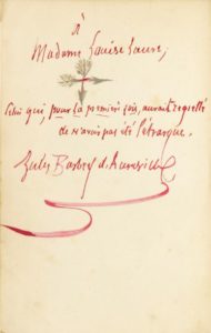BARBEY D'AUREVILLY (Jules) Une Histoire sans nom. Cinquième édition. Paris, Alphonse Lemerre, 1882. In-12, maroquin rouge, triple filet gras et maigre, dos lisse orné de motifs dorés, triple filet intérieur, tête dorée, non rogné, couverture et dos (L. Genet). Édition originale, avec un titre renouvelé portant une mention fictive de cinquième édition. C'est le seul de tous les romans de Barbey dont l'action ne se passe ni en Normandie ni à Paris. Une Histoire sans nom reprend des souvenirs du voyage fait par l'écrivain à Bourg-Argental, dans les Cévennes. Ce fut en quelque sorte sa «madeleine-Proust», car c'est apparemment en ce lieu, alors qu'il écrivait, à l'auberge, sa Vieille maîtresse, que lui revinrent tous ses souvenirs d'enfance qui passèrent dans la deuxième partie «normande» de ce roman (cf. cat. Barbey d'Aurevilly, 1989, n°124). Spirituel envoi autographe signé de l'auteur, à l'encre rouge et accompagné de deux flèches du sagittaire croisées rehaussées d'argent, au verso de la couverture: à Madame Louise Laure, Celui qui, pour la première fois, aurait regretté de n'avoir pas été Pétrarque. Jules Barbey d'Aurevilly. À en juger par le ton de ce bel envoi, Barbey semble envoûté comme le fut Pétrarque pour sa muse Laure de Noves. L'envoi est relevé par Bonnefon, Les Dédicaces à la main de M. J. Barbey d'Aurevilly, p. 82. On relève dans l'exemplaire 2 corrections manuscrites de la main de Barbey (pp. 66 et 208). Des bibliothèques Roger-Pierre Monmélien, l'un des grands admirateurs posthumes de Barbey d'Aurevilly, et Gaston Maury. Deux cahiers légèrement roussis