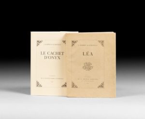 BARBEY D'AUREVILLY (Jules) Léa. S.l., Aux dépens de la Société normande du livre illustré, 1907. — Le Cachet d'onyx. S.l., Aux dépens de la Société Barbey d'Aurevilly, 1992. Ensemble 2 ouvrages en 2 volumes petit in-12 carré, brochés. Première édition en librairie de Léa, tirée à 90 exemplaires et ornée en frontispice d'un portrait en médaillon de l'auteur gravé en couleurs par Maccard. Exemplaire tel que paru, broché: tiré sur papier vélin fort, il est à l'état de neuf. De la bibliothèque du docteur Lucien-Graux. Décharge des remplis de la couverture sur les pages leur faisant face. Première édition du Cachet d'onyx établie sur le manuscrit complet du texte original acquis en 1992 par le Musée Barbey d'Aurevilly, offrant ainsi le texte enfin fiable et complet d'une nouvelle annonciatrice des Diaboliques. Elle présente en effet de notables différences avec la version parue en 1919. Écrite à l'âge de 23 ans, cette œuvre de jeunesse n'a jamais paru du vivant de Barbey. Tirage à 300 exemplaires numérotés sur Lana, celui exemplaire de tête, le n°1. Les deux plaquettes sont préservées dans une chemise demi-maroquin orangé et un étui modernes