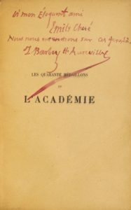 BARBEY D'AUREVILLY (Jules) Les Quarante médaillons de l'académie. Nouvelle édition. Paris, Albert Savine, s.d. In-12, cartonnage souple toile rayée à motifs floraux, couverture (Reliure vers 1900). Nouvelle édition de ce pamphlet dirigé contre l'Académie française et initialement paru en 1864. Envoi autographe signé de l'auteur sur le faux-titre: à mon éloquent ami Emile Cheré Nous nous entendrons sur ces gens-là. J. Barbey d'Aurevilly. Barbey a toujours refusé d'entrer à l'Académie, qu'il considérait comme un hâvre de vieux hérons moroses. Pliure à l'angle inférieur du faux-titre. Piqûres à l'angle des pp. 28-29. Rousseurs sur la couverture dont le fond du premier plat est renmargé