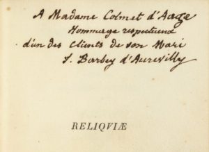 GUÉRIN (Eugénie de) Reliquiae. Publié par Jules Barbey d'Aurevilly et G.-S. Trebutien. Caen, Imprimerie de A. Hardel, 1855. Petit in-12 carré, maroquin rouge, double filet doré, dos orné de filets dorés, dentelle intérieure, tranches dorées, étui (Veuve Pouillet). Édition originale très rare, non mise dans le commerce et tirée à petit nombre: 50 exemplaires dit-on, plus au moins un exemplaire sur papier rose (Clouzot). Recueil publié par Trebutien et Barbey d'Aurevilly, qui en signe la préface dans laquelle il fait l'éloge d'Eugénie de Guérin (1805-1848): Tiré à quelques exemplaires pour être placé sous des yeux choisis, discret, pudique et presque mystérieux, ce petit volume n'est pas un livre dans le sens retentissant du mot. [...] C'est l'expression d'un sentiment naturel qui, à force de profondeur et de beauté vraie, a rencontré, sans la chercher, la forme littéraire la plus exquise... Maurice de Guérin avait une sœur, non pas seulement de sang, mais de génie. Exemplaire sur papier de Hollande, portant sur le faux-titre cet envoi: À Madame Colmet d'Aage hommage respectueux d'un des clients de son mari, J. Barbey d'Aurevilly. Envoi écrit par Trebutien à la demande de Barbey d'Aurevilly désireux d'offrir un exemplaire à son avocat: Je voudrais offrir à mon avocat les Reliquiae. Vous savez que j'ai des procès dont je vous ai parlé quelquefois. Ces procès pour me sortir de cette forêt de Bondy dont je ne sortirai qu'en morceaux [...] cet avocat est M. Colmet Daage, l'homme le plus digne de relever son abominable profession. [...] Vous écrirez sur son exemplaire: à Madame Colmet Daage - hommage respectueux d'un des clients de son mari. - Jules B. d'A. (Barbey d'Aurevilly, lettre à Trebutien, 10 janvier 1856, in Correspondance générale, V, p. 107). Ex-libris Geo Valdelièvre, gravé par Perrichon d'après Pierre Fritel