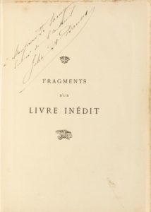 DAUDET (Julia) Fragments d'un livre inédit. Paris, Charavay frères, s.d. [1884]. In-12, bradel demi-veau havane avec coins, dos lisse portant le titre doré en long, chiffre doré en tête et queue, tête dorée, non rogné, couverture (Reliure de l'époque). Édition originale, dédiée à Théodore de Banville. Exemplaire de Francisque Sarcey (1827-1899), journaliste et critique dramatique, relié à son chiffre et portant un envoi signé de Julia Daudet. Lettre signée de l'auteure (3 pages sur 2 cartes de papier bristol au nom de Julia Daudet) montée en tête. Petites piqûres sur le premier plat. Minimes frottements aux coins et coiffes