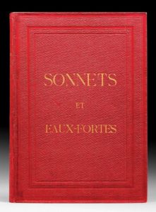 MANET (Édouard) Sonnets et eaux-fortes. Paris, Alphonse Lemerre, 1869. In-folio, percaline à long grain rouge, filet à froid sur les plats, titre en grandes capitales dorées sur le premier, non rogné (Reliure de l'éditeur). Édition originale, publiée sous la direction de Philippe Burty. Recueil de 42 sonnets d'auteurs contemporains (Théodore de Banville, Anatole France, Théophile Gautier, Jose-Maria de Heredia, Leconte de Lisle, Verlaine, etc.), chacun d'eux étant accompagné d'une gravure à l'eau-forte. Cette remarquable illustration, en premier tirage, comprend 41 eaux-fortes originales de grands peintres ou graveurs, tels Édouard Manet dont l'eau-forte pour Fleur exotique illumine le recueil, Corot, Jongkind, Doré ou encore Millet, ainsi qu'une eau-forte reproduisant un dessin de Victor Hugo. Les planches furent détruites après le tirage. Un des 350 exemplaires sur papier vergé. Exemplaire dans le cartonnage de l'éditeur. Coiffe supérieure et partie inférieure du dos (sur 10 cm) habilement restaurées