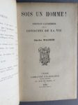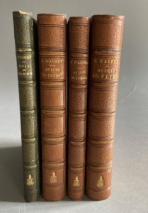 WAGNER (Charles) Le Long du chemin. Paris, Librairie Fischbacher, 1896. — Auprès du foyer. Paris, Armand Colin et Cie, 1898. — Sois un homme ! Simples causeries sur la conduite de la vie. Paris, Librairie Fischbacher, 1899. — Le Long du chemin. Quatrième édition, considérablement augmentée. Paris, Librairie Fischbacher, 1901. Ensemble 4 volumes in-12, maroquin fauve (vert foncé pour un volume), double filet à froid, chiffre doré aux angles, dos orné avec chiffre répété en queue, dentelle intérieure, tranches dorées (Vignal 1905). Réunion de 4 ouvrages de Charles Wagner (1852-1918), pasteur et écrivain natif de Moselle, dont les trois premiers sont en édition originale. Exemplaires reliés au chiffre du baron Fernand de Schickler (1835-1909), banquier et historien qui fut président de la Société d'histoire du protestantisme français, avec envoi signé de l'auteur adressé au même dans chaque volume. Papier jauni. Léger choc sur un des plats, sans gravité; petit manque à une coiffe