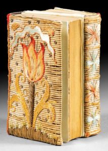 RELIURE. — BOOK OF COMMON PRAYER (The). London, Eyre & Spottiswoode, s.d. [vers 1890]. — HYMNS ancient and modern for use in the Services of the Church. London, William Clowes and Sons, s.d. [vers 1890]. Ensemble 2 ouvrages in-16, reliure dos-à-dos, décor floral brodé aux fils d'or, d'argent et de soie polychrome, doublure et gardes de satin, tranches dorées, boîte de plexiglas moderne (Reliure anglaise de l'époque). Charmant et rare spécimen de reliure brodée jumelle. Légers manques de soie aux dos