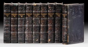 SHAKESPEARE (William) The Plays. London, William Pickering, 1825. 9 volumes in-24, veau noir, décor à froid sur les plats et le dos, doublure et gardes de papier doré à motifs végétaux en couleurs, tranches marbrées, étui (Reliure de l'époque). Charmante édition minuscule des oeuvres complètes de Shakespeare, illustrée d'un portrait de l'auteur par Augustus Fox et de 37 figures gravées sur cuivre. Joliment relié. Frottements aux charnières