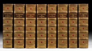 SHAKESPEARE The Pictorial edition of the works of Shakespeare. Londres, Charles Knight and Cie, 1839-1843. 8 volumes grand in-8, maroquin brun, jeu de 10 filets dorés en encadrement, dos orné autour d'un petit cartouche de maroquin rouge, encadrement intérieur orné de jeux de filets dorés, doublure et gardes de moire rouge, tranches dorées (Noulhac). L'une des plus fameuses éditions de Shakespeare, superbement illustrées de très nombreuses gravures sur acier. Elle comprend les pièces douteuses et une vie de l'auteur. Dos très légèrement passé, sinon luxueux exemplaire dans une riche reliure de Noulhac