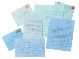 COLETTE Ensemble de 4 lettres autographes signées, la plupart adressées à l'écrivain Jean-Joseph Renaud (1873-1953). - L.A.S. [à Saurel?]. S.l.n.d. [6 février 1941, selon une note]. 2 pp. in-4. Papier bleu. En-tête «9, rue de Beaujolais». «[...] cher sorcier, il faut que je sois bien embarrassée pour vous écrire [...] mon charbon de l'année dernière fond comme sucre. Si je n'ai plus de chaleur, je ne peux plus travailler, parce que, comme le père Richepin, je ne puis travailler que si j'ai chaud, si nous avons chaud, mon arthrite de la hanche et moi [...]». Elle cherche où acheter du charbon «même de la plus noire espèce. Je sais parfaitement que c'est une question indécente. Mais vous avez signé: sorcier en tous genres [...]». - L.A.S. S.l.n.d. [cachet postal à la date du 16 octobre 1948]. 1 p. in-8 oblong. Papier bleu. Enveloppe conservée. «Du sein d'un lent orage de travail je vous assure que je n'ai rien signé avant 1904. Et pour cause, M. Willy y voyant mille inconvénients [...]». - L.A.S. S.l.n.d. [cachet postal à la date du 6 avril 1951]. 1 p. in-4. Papier bleu. Enveloppe conservée avec «Académie Goncourt» gravé. «Cher ami, j'aime bien que nos souvenirs se donnent la main. Le camarade se prénommait sans doute Georges; le professeur c'était Pierre, le plus intelligent. Je ne peux toujours pas marcher [...]». -L.A.S. S.l.n.d. [cachet postal à la date du 16 avril 1946]. 1 p. 1/3 in-4. Papier bleu. Enveloppe conservée. «[...] Je crois que le Matou a paru d'abord au «Matin». Il doit avoir pris sa retraite dans La Paix chez les bêtes, - ou je me trompe... Merci d'avoir évoqué ce souvenir de Kipling [...]»