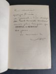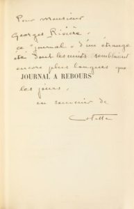 COLETTE Journal à rebours. Paris, Arthème Fayard, 1941. In-12, maroquin noir, janséniste, dos lisse portant le titre doré, tranches dorées sur témoins, couverture et dos, étui (Devauchelle). Édition originale. Un des 20 exemplaires sur hollande, premier grand papier. Envoi signé de Colette sur le faux-titre: Pour Monsieur Georges Rivière, ce «journal» d'un étrange été dont les nuits semblaient encore plus longues que les jours, en souvenir de Colette