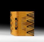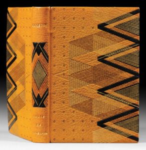 COLETTE Julie de Carneilhan. Paris, Librairie Arthème Fayard, 1941. In-12, maroquin citron; jeux de multiples filets obliques à froid et dorés, certains se croisant, fuyant du bord extérieur des plats vers le dos, avec petite bande zigzagante de maroquin noire sur le bord, semé de petits c à froid ornant la partie restante des plats, dos lisse avec rappel du décor, nom de l'auteur et titre en capitales dorées, encadrement intérieur de maroquin de même couleur orné d'un semé de petits c, doublure et gardes de moire vert sapin, tranches dorées sur témoins, couverture et dos, boîte-étui de toile bleue moderne (Pierre Legrain - J. Anthoine Legrain). Édition originale. Un des 20 exemplaires de tête sur hollande. Très belle reliure à décor symétrique parfaitement exécutée par Jacques-Anthoine Legrain d'après une maquette de Pierre Legrain